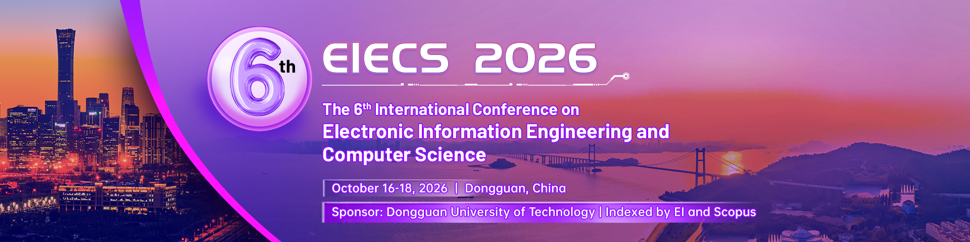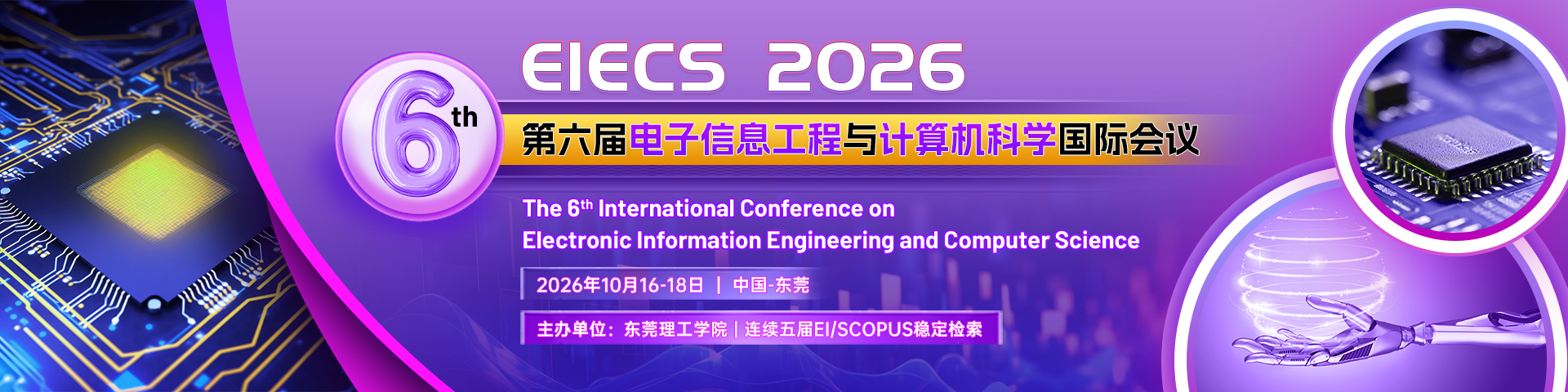 2026 6th International Conference on Electronic Information Engineering and Computer Science (EIECS 2026) will be held on October 16-18, 2026, in Dongguan, China. This conference takes "bringing together global wisdom in scientific innovation to promote high-quality development" as the theme and focuses on electronic information engineering and computer science. This conference aims to boost the development of the computer Science field, expand channels of international academic exchange in science and technology, build a sharing platform of academic resources, promote scientific innovation on a global scale, and improve academic cooperation between China and the outside world. It also aims to encourage the exchange of information on research frontiers in different fields, connect the most advanced academic resources in China and abroad, turn research results into industrial solutions, and bring together talents, technologies, and capital to boost development.